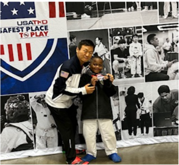 In 2024, I got to go to Nationals, and it was so exciting! I felt nervous at first, but then I remembered all my training. I won the Tiger and Dragon match and got a bronze patch from the USATKO National Championship. I was so proud of myself! Now I have 15 trophies and medals from Taekwondo.